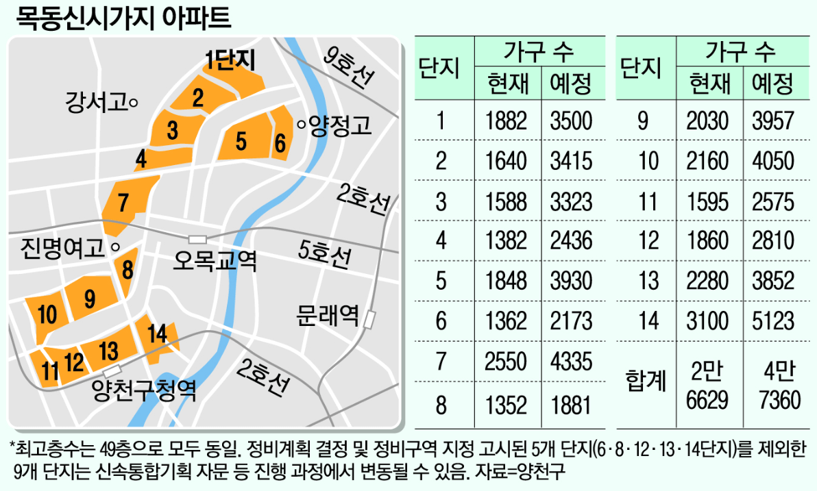 목동신시가지는 총 14개 단지로 구성되어 있으며, 재건축 완료 시 총 47,360가구 규모로 확대됩니다. 단지별 계획은 다음과 같습니다.